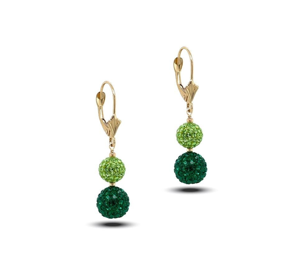 This is 14K Yellow Gold Lever Back Dangle Earrings with Genuine Czech Crystals . The length is 38mm and balls diameter is 8mm and 10mm . The pair weight about 3.38 gram .