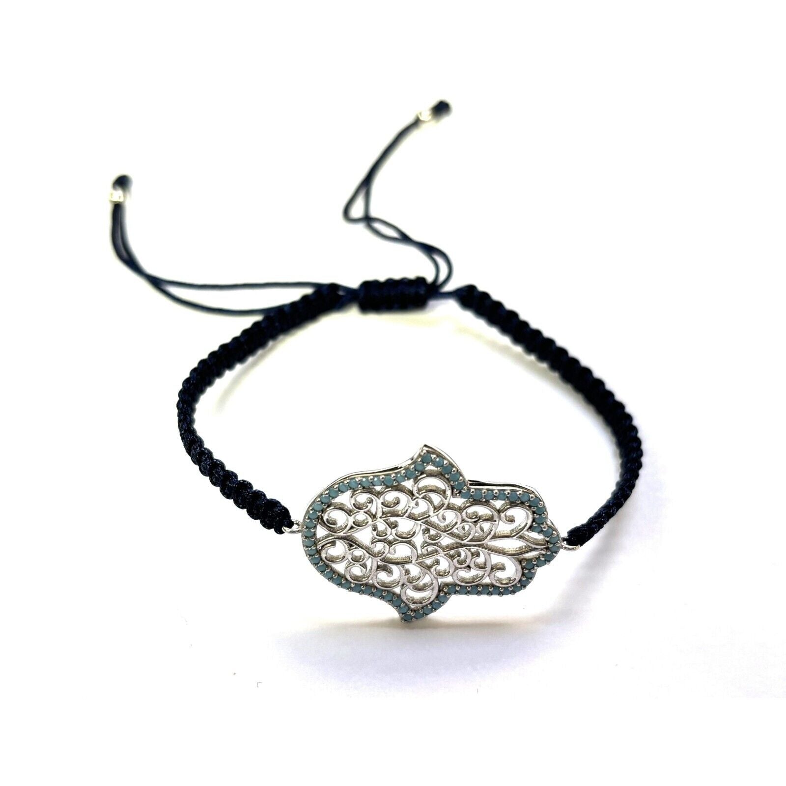 This Hamsa Bracelet is made of 925 Sterling Silver with Cubic Zirconia Crystals and Blue Nylon Threat.