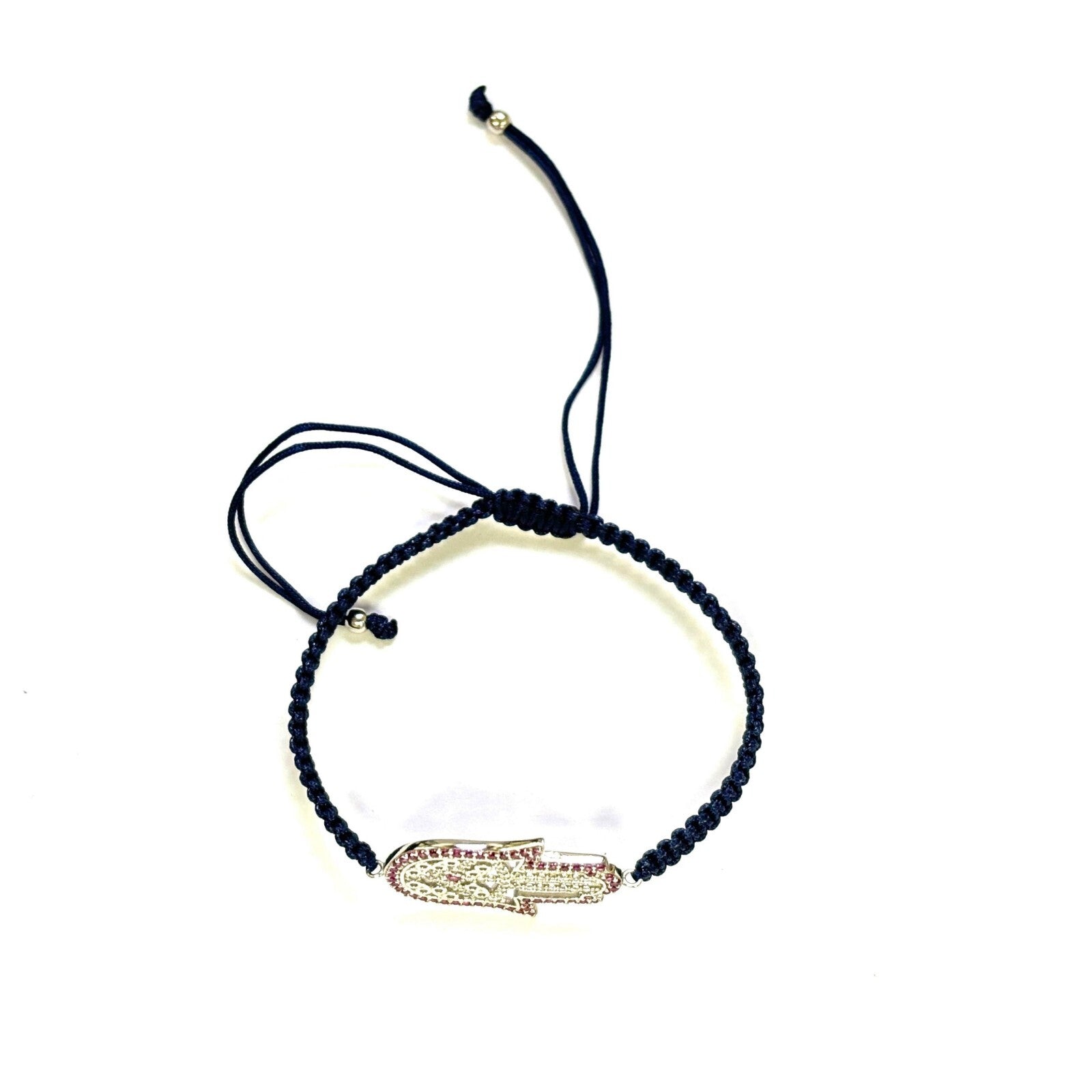 This Hamsa Bracelet is made of 925 Sterling Silver with Cubic Zirconia Crystals and blue nylon threat.