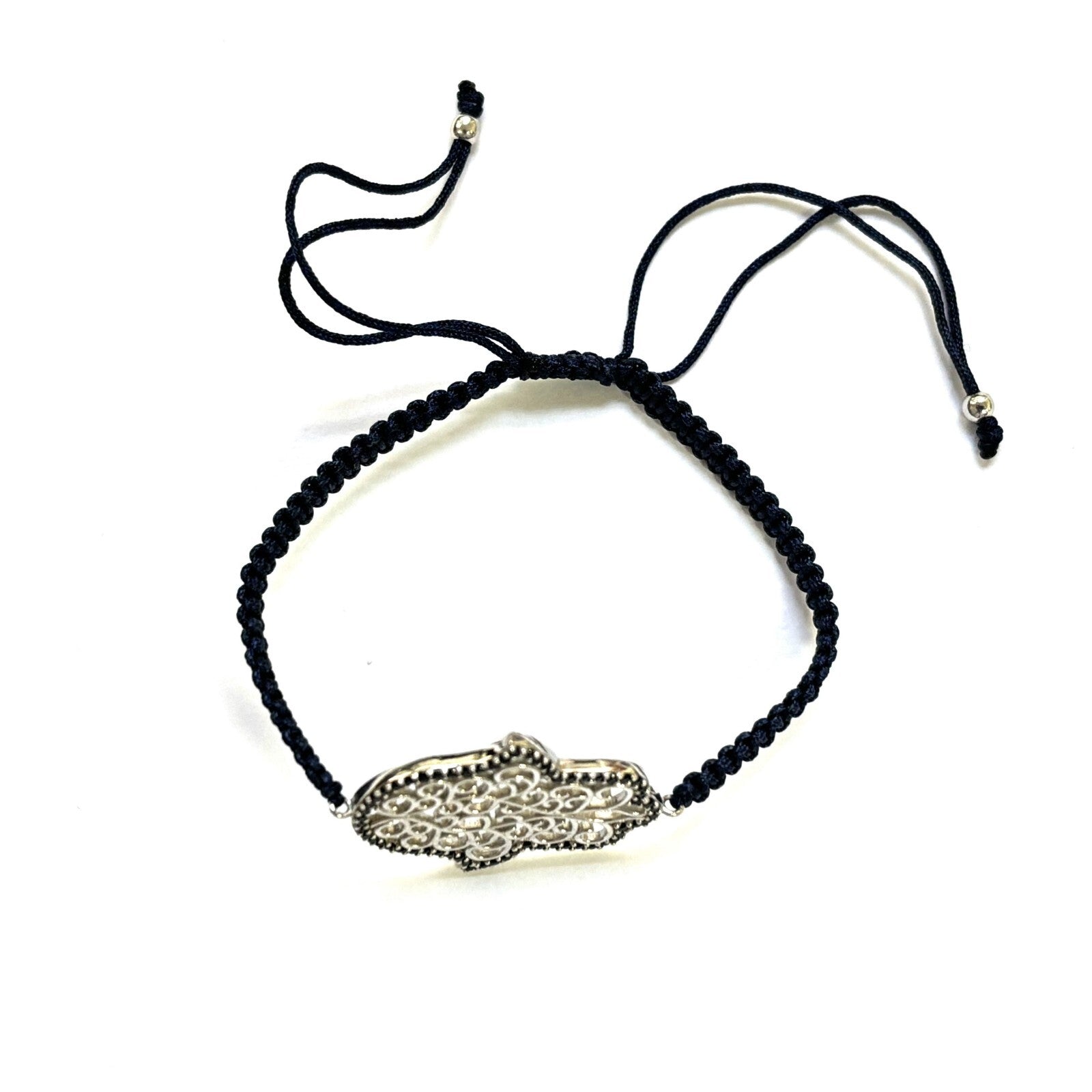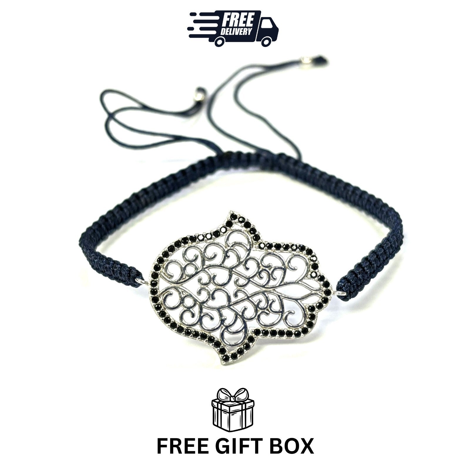 This Hamsa Bracelet is made of 925 Sterling Silver with Cubic Zirconia Crystals and blue nylon threat.