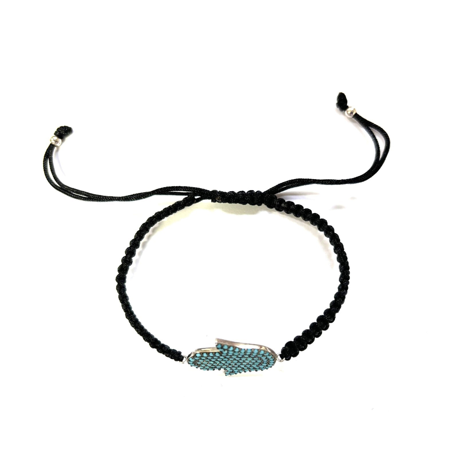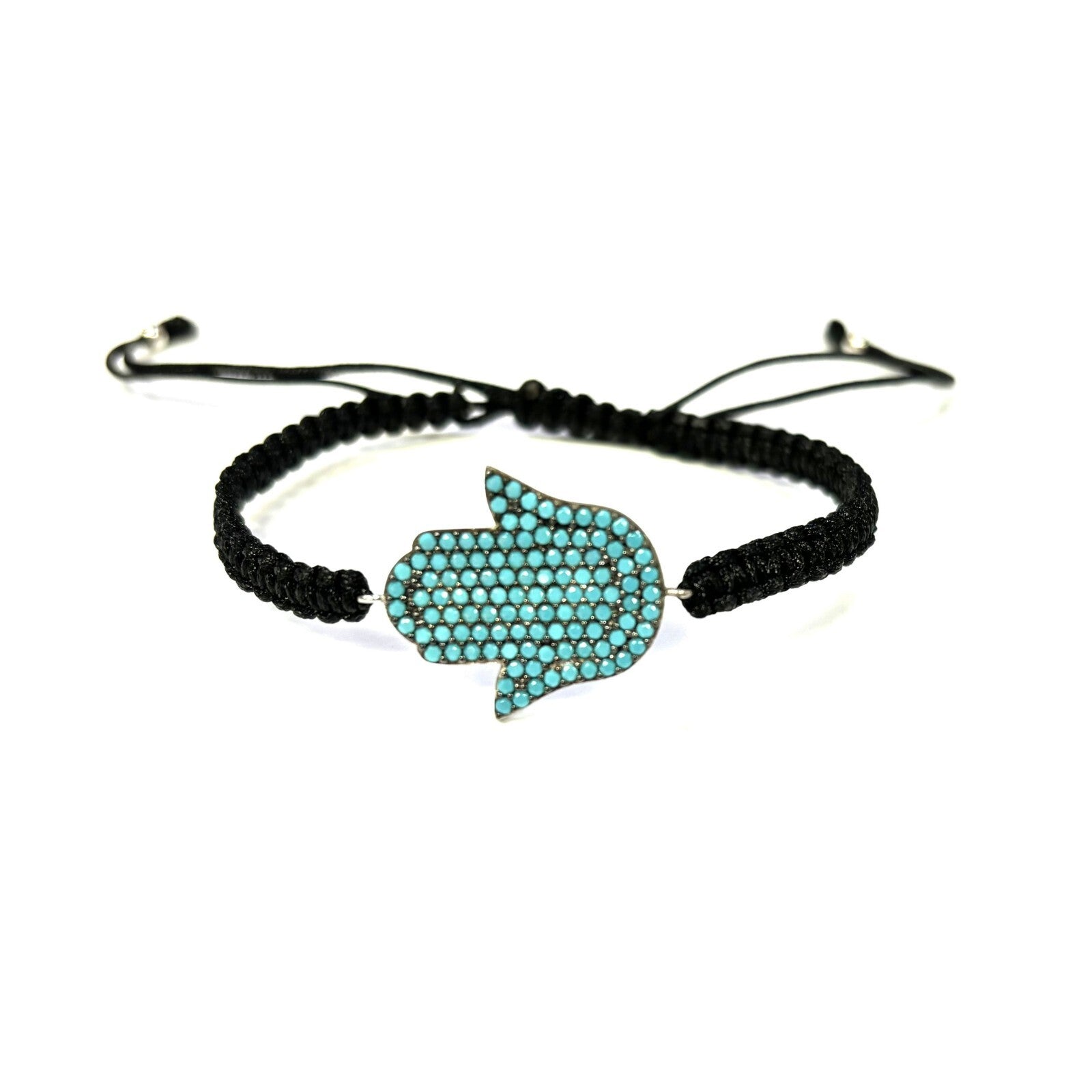 This Hamsa Bracelet is made of 925 Sterling Silver with Lab Created Stones and Black Nylon Threat.